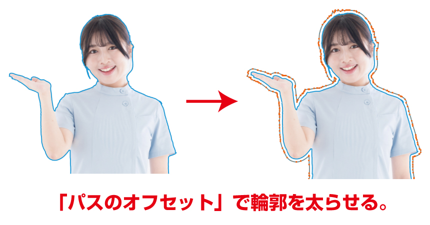 フチの太さはお好みですが、オーソドックスなのはフチ10mmでしょう。「オブジェクト>パス>パスのオフセット」で線を10mm大きくします。元の線が残るので「グループ選択ツール」等で削除しておきましょう。