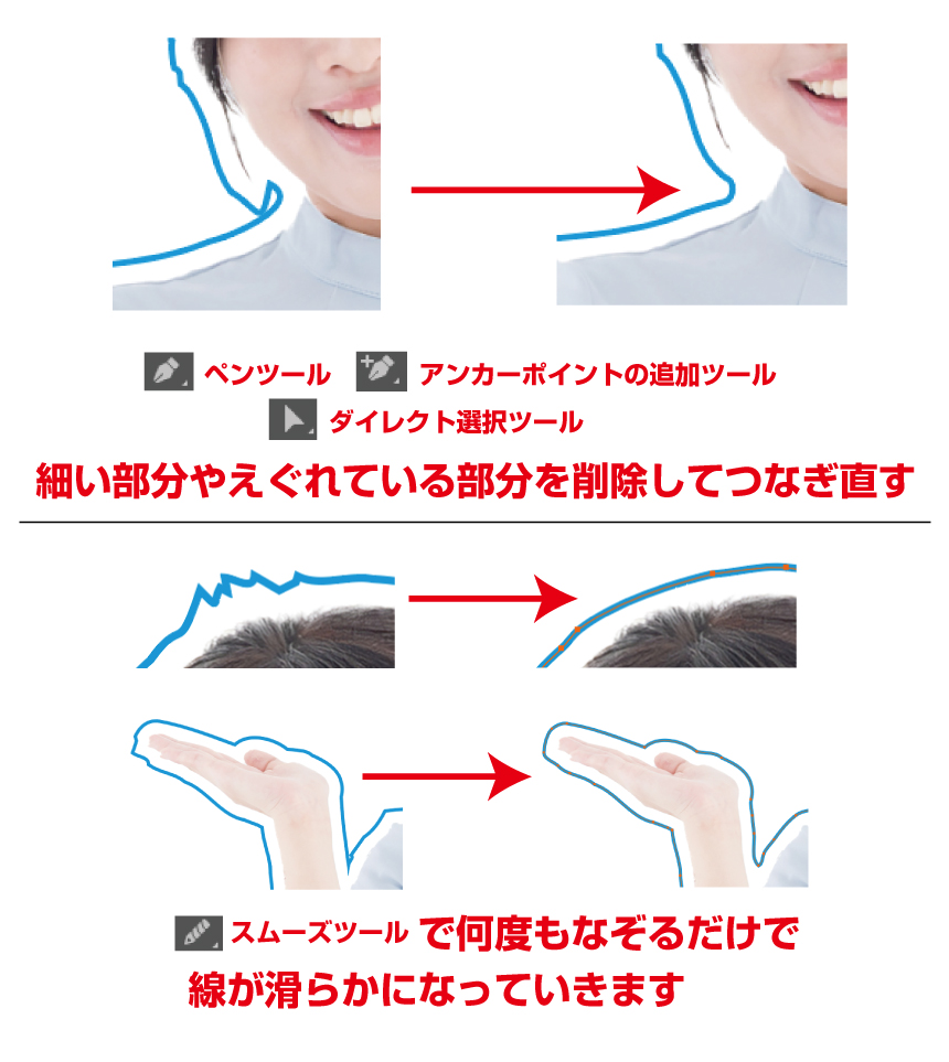 そこでコンドットとA山が推奨するのは、「細くなっている部分を削除してつなげ直す」「あとはこまかいことを考えず、形状が乱れているかな、と思う箇所をとにかく滑らかにする」という2点に絞って作業すること。これでたいていはエラーの出ない線を完成させられます。以下の手法でおこなうとよいでしょう。