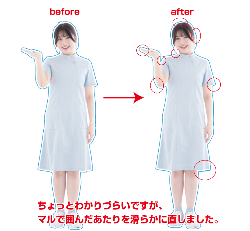 と、いう感じですね。線を滑らかにしてもどうしようもない部分、それこそ細くなってしまった箇所や、下図に示したようなえぐれている部分は「A.」で、単にギザギザを直したい箇所は「B.」で処理しましょう。