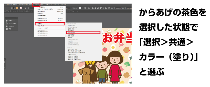 では、「からあげ」の茶色を選択した状態で「選択>共通>カラー(塗り)」を選んでみましょう。