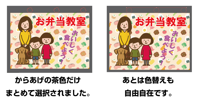 どうでしょうか。「からあげ」の茶色が一斉に選択されましたね。この状態でカラーを変えてやれば、すべての「からあげ」の茶色を濃くすることも薄くすることも自由自在です。