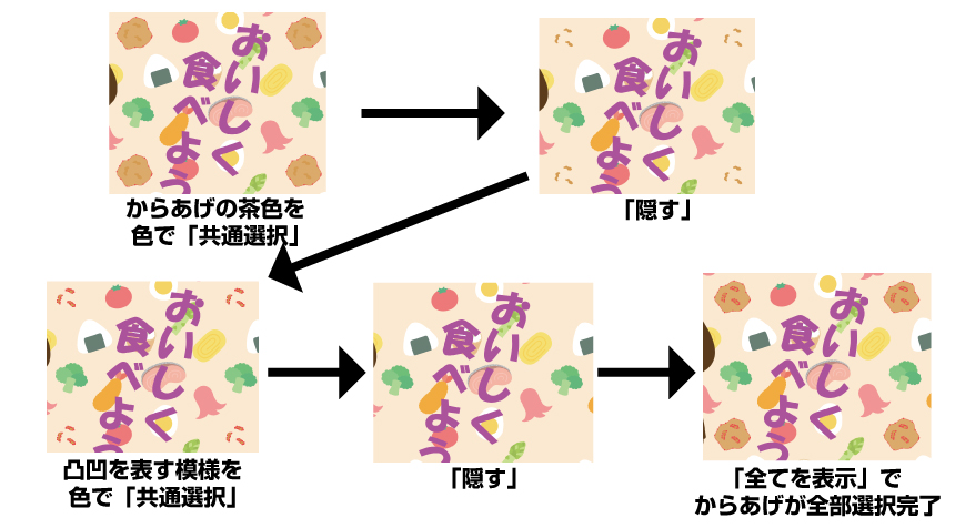 「からあげ」は2色のオブジェクトで構成されていますので、まずコロモの部分の色で「共通選択」し、いったんそれを「隠す」します。つづいて「からあげ」の凸凹を表現している線みたいなオブジェクトの色で「共通選択」して、それを隠します。