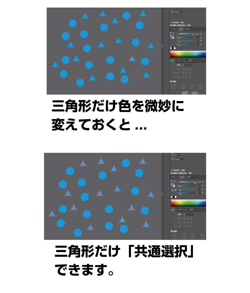 たとえば同じ色のさまざまな図形をたくさん配置したいが、三角形だけはのちのち削除する可能性がある…なんてケース。ほかの図形はすべてC100に設定しておくが、三角形だけC99.99に設定しておけば、のちのち三角形だけを「共通選択」することができます。