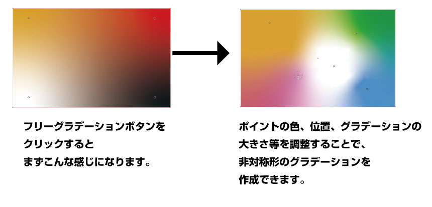上記の操作を組み合わせて非対称形のグラデーションを作成できるのが「フリーグラデーション」です。適用するとカラフルなモヤみたいな感じになりますね。
