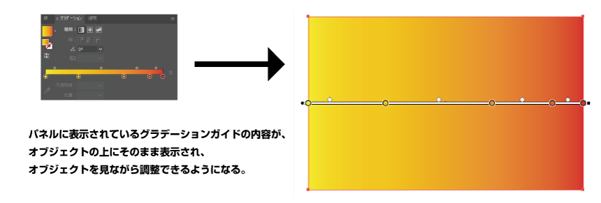 グラデーションの具体的なつくりは⑫のグラデーションガイドで調整するのですが、これをアートワーク中に表示できます。グラデーションを調整した結果がアートワーク中でどのように見えるのかを、操作しながら確認できるので大変便利です。
