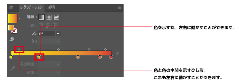 ガイド下部の丸は色を示します。クリックでそれぞれの丸を選択できます。色の変更はカラーパネルでおこないます。左右にドラッグすれば色の開始位置を調整できます。