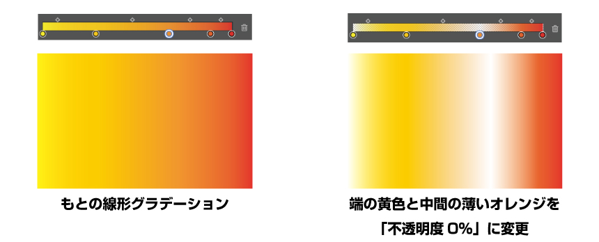 選択した色の不透明度を調整できます。例えば図のような形式のグラデーションで、色を選択して不透明度を「0%」にすると、徐々に透明へと変化してゆくグラデーションを作成できるということです。