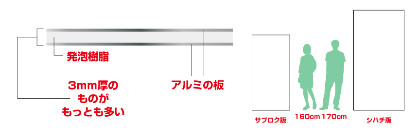 寸法はいろいろありますが、メジャーなのは「サブロク版」と「シハチ版」。前者は縦横が3尺・6尺、後者は4尺・8尺。メートル法に直すとおよそ900*1800mmと1200*2400mmです(実際の製品は延びしろとして、これより各辺数cm程度大きくなっています)。看板用に使われることが多い材料なのででかいです。