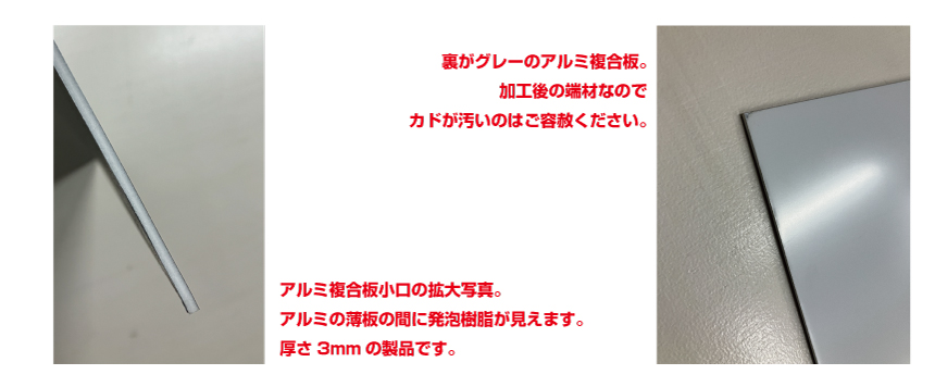 なお、前回紹介した「不燃系」のアルミ複合板はコンドットのサイト商品としては取り扱っておりません。アルミ複合板を使用する商品ではすべて非不燃のアルミ複合板を使用しています。