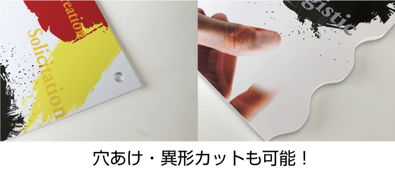 アルミ複合板はカットマシンを使えば異形カットもできますので、キャラクターの形状に切り抜かれたサインや角丸の付いたサインもアルミ複合板であることが多いです。