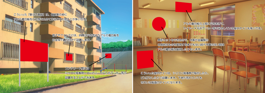 室内のサインにもよく用いられます。ホームセンター等の大きな店舗で天井から吊られているサイン、柱に貼ってあるサインなどはたいていアルミ複合板かスチレンボード。薄ければアルミ複合板、厚ければスチレンボードでしょうね。さすがにスチレンボードのほうがかなり安価ですが、耐久性はアルミ複合板のほうが圧倒的に上なので、長期使用を想定する場合はアルミ複合板が選ばれます。