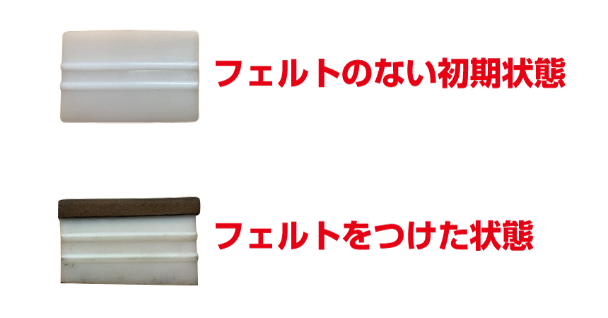 スキージはただのプラスチックの板ですが、写真のように、一方の長辺にフェルトのような分厚い布が巻き付いております。この部分をシールにあててこすることで、空気が入ったりすることなく面にシールを密着させてゆくことが可能になります。