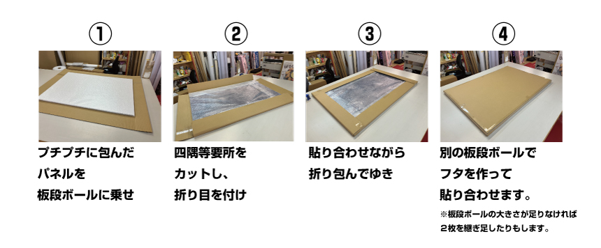 なお、パネルそのものはエアキャップ(いわゆる「プチプチ」)でしっかり包みます。業務用のお化けみたいにでかいロールですので、大判パネルも全体をしっかり包みますよ。