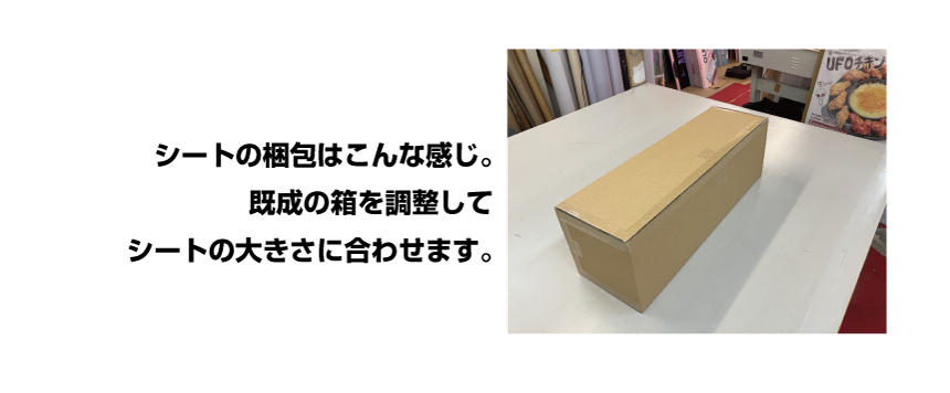 パネルに比べてシート(塩ビシート・床シート等)の梱包はシンプルです。シートの出力巾は1200mm程度が最大ですので、箱の巾も最大で1200mm強あれば足りるという理屈になります。その寸法の箱を用意して、実際の床シート巾に合わせて切ったり貼ったりしながらぴったりの箱を作ります。シート本体はロールに巻いたうえでプチプチに包んでおります。