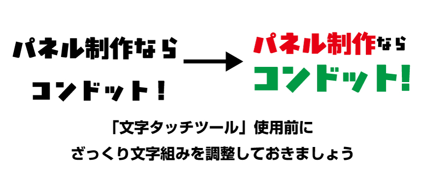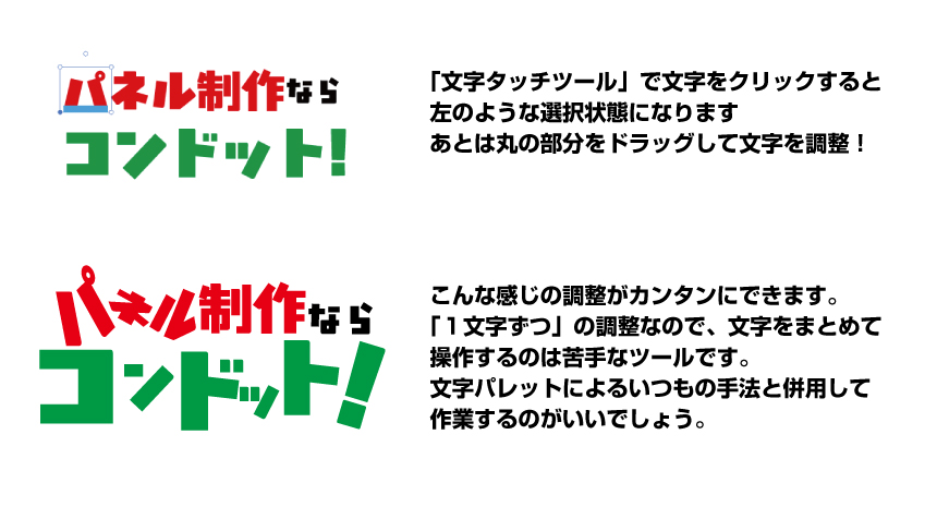 文字タッチツールは、テキストをアウトライン化せずに“1文字単位”で調整できる便利機能です。同じことは伝統的な手法でももちろん可能ですが、とんでもない手間がかかりますよね。「文字タッチツール」、ガンガン使っていきましょう。