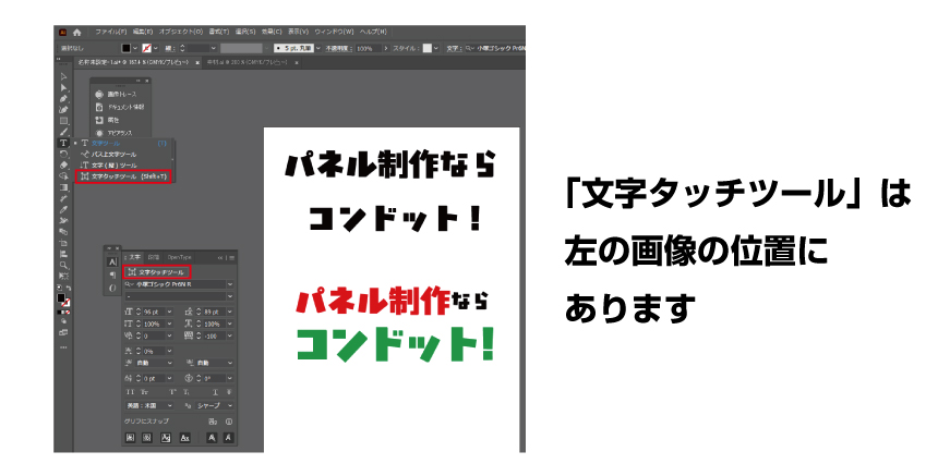 「文字タッチツール」は文字パレットにあります。左のツールバーからも選べます(ツールバーをカスタマイズしていないと無い場合があります)。